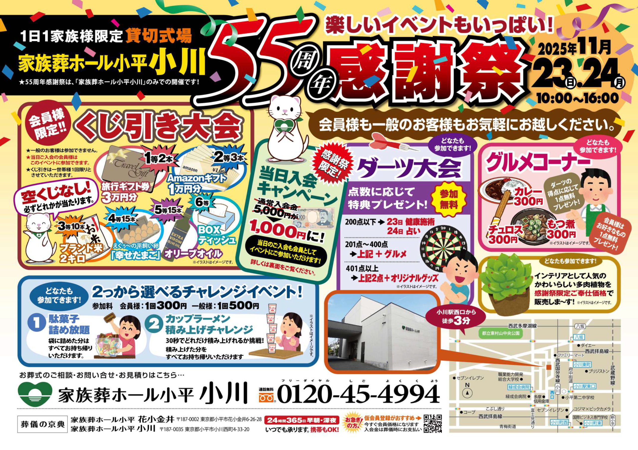 2018年には小川駅西口に家族葬専用式場家族葬ホール小平をOPENしました。
