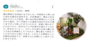 ○○様 義父の葬儀で大変お世話になり、ありがとうございました。 義父の好きな食べ物、思い出、愛用品などを飾ってくださり、 それを通して参列下さった方々が思い出話に花が咲いて いました。 京典さん側でもサプライズで私達が話…