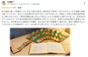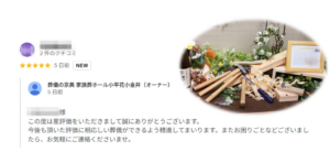 ★★★★★ (京典より) この度は星評価をいただきまして誠にありがとうございます。 今後も頂いた評価に相応しい葬儀ができるよう精進してまいります。 また、お困りごとなどございましたら、お気軽にご連絡ください…