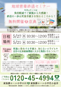 毎回ご好評をいただいております、終活セミナーのお知らせです。 5月27日(水)10:30~12:00 家族葬ホール小平 花小金井にて 5月21日(木)10:30~12:00 家族葬ホール小平 小川にて お日にち、開催場所…
