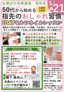 5月21日(木)に家族葬ホール小平 花小金井にて 「1DAYセルフネイルレッスン」がございます。 まだ席に余裕がございますので、会員様だけでなく、お友達もお誘いの上 ぜひご参加ください。 ご自分でネイルをする際のポイント…