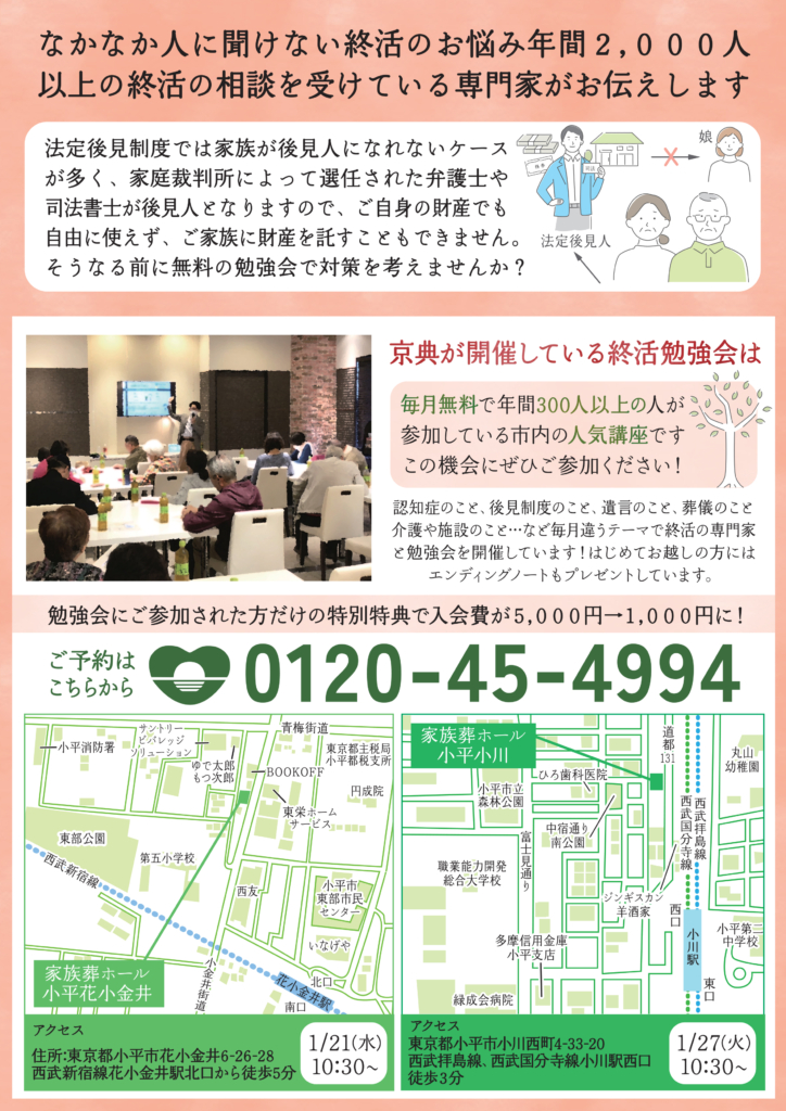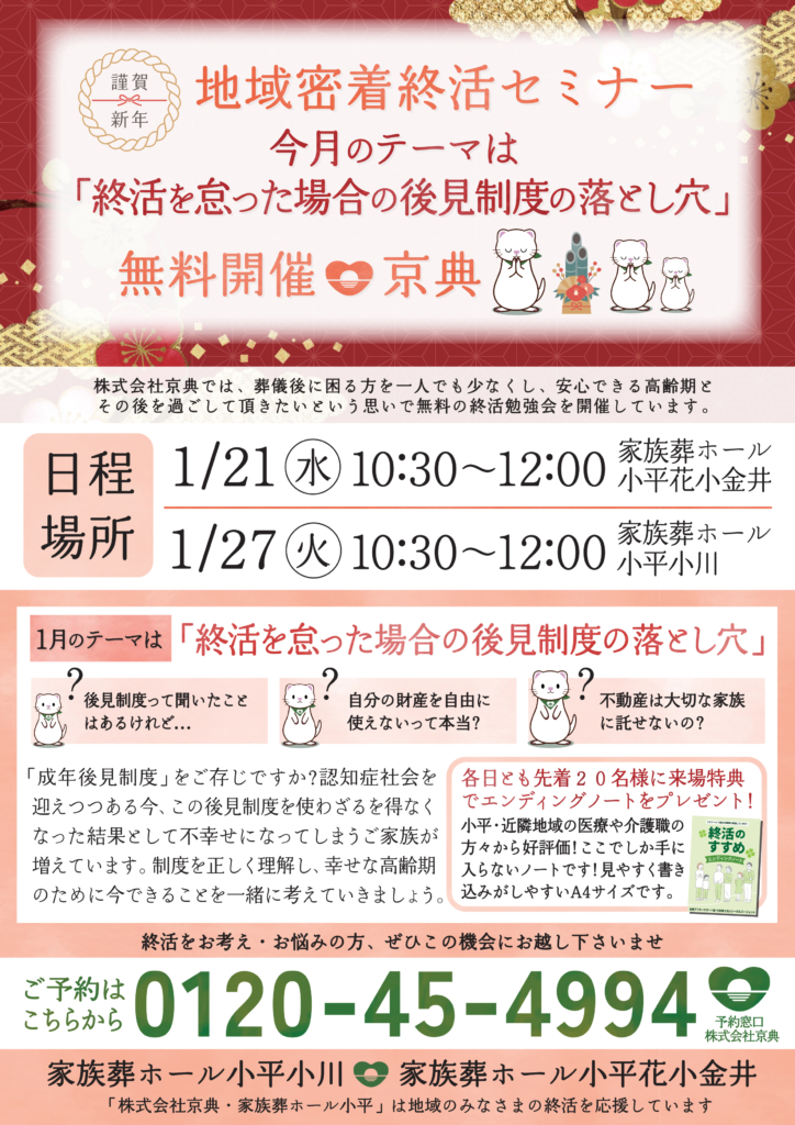【2026年1月 終活セミナーのお知らせ】です! 2025.12.26 最新情報 2026年1月のセミナーのお知らせです。 来年も皆様のお役に立てるようなセミナーを開催したいと思いますので どうぞよろしくお願いいたします。 <