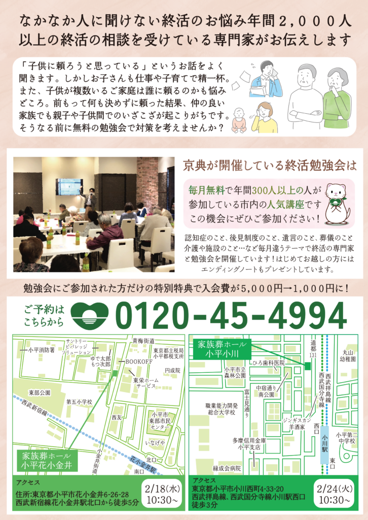 【2月の終活セミナー】ご案内 2026.01.11 最新情報 2月18日(水)10:30~12:00 家族葬ホール小平 花小金井にて 2月24日(火)10:30~12:00 家族葬ホール小平 小川にて <