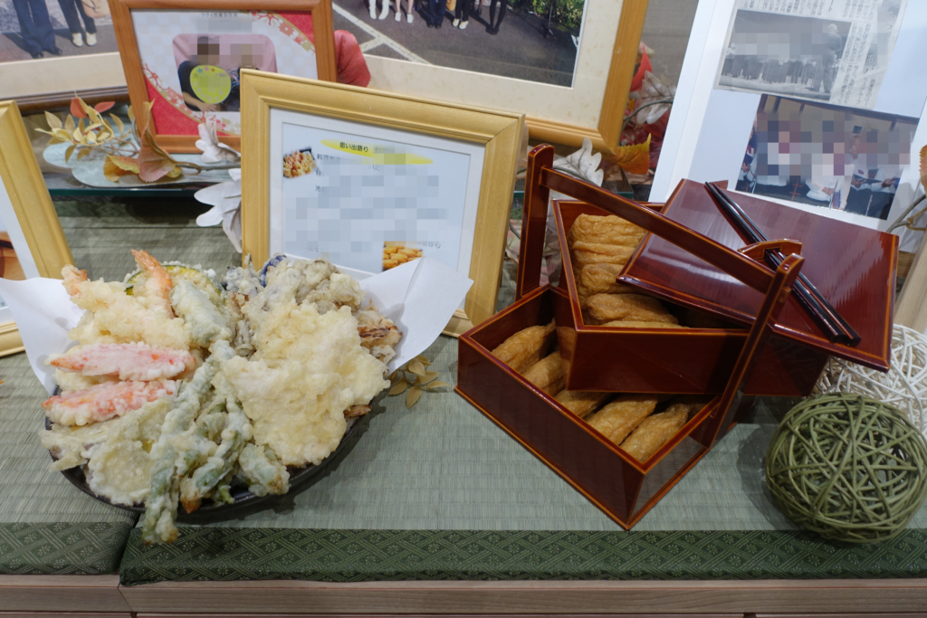 故人様と言えばこの料理!山盛りの天ぷらと重箱いっぱいのいなり寿司。思い出コーナーで再現いたしました。