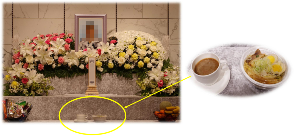 故人様がお好きだったコーヒーとラーメン。ご家族の皆様に作っていただいた後、祭壇にお供えいたしました。