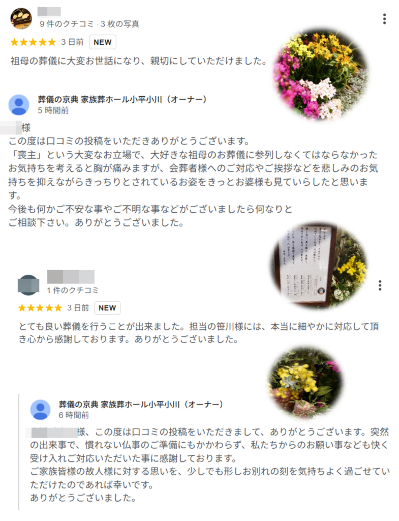 【京典より】○○様 この度は口コミの投稿をいただきまして、ありがとうございます。突然の出来事で、慣れない仏事のご準備にもかかわらず、私たちからのお願い事なども快く受け入れご対応いただいた事に感謝しております。ご家族皆様の故人様に対する思いを、少しでも形にしお別れの刻を気持ちよく過ごせていただけたのであれば幸いです。ありがとうございました。
